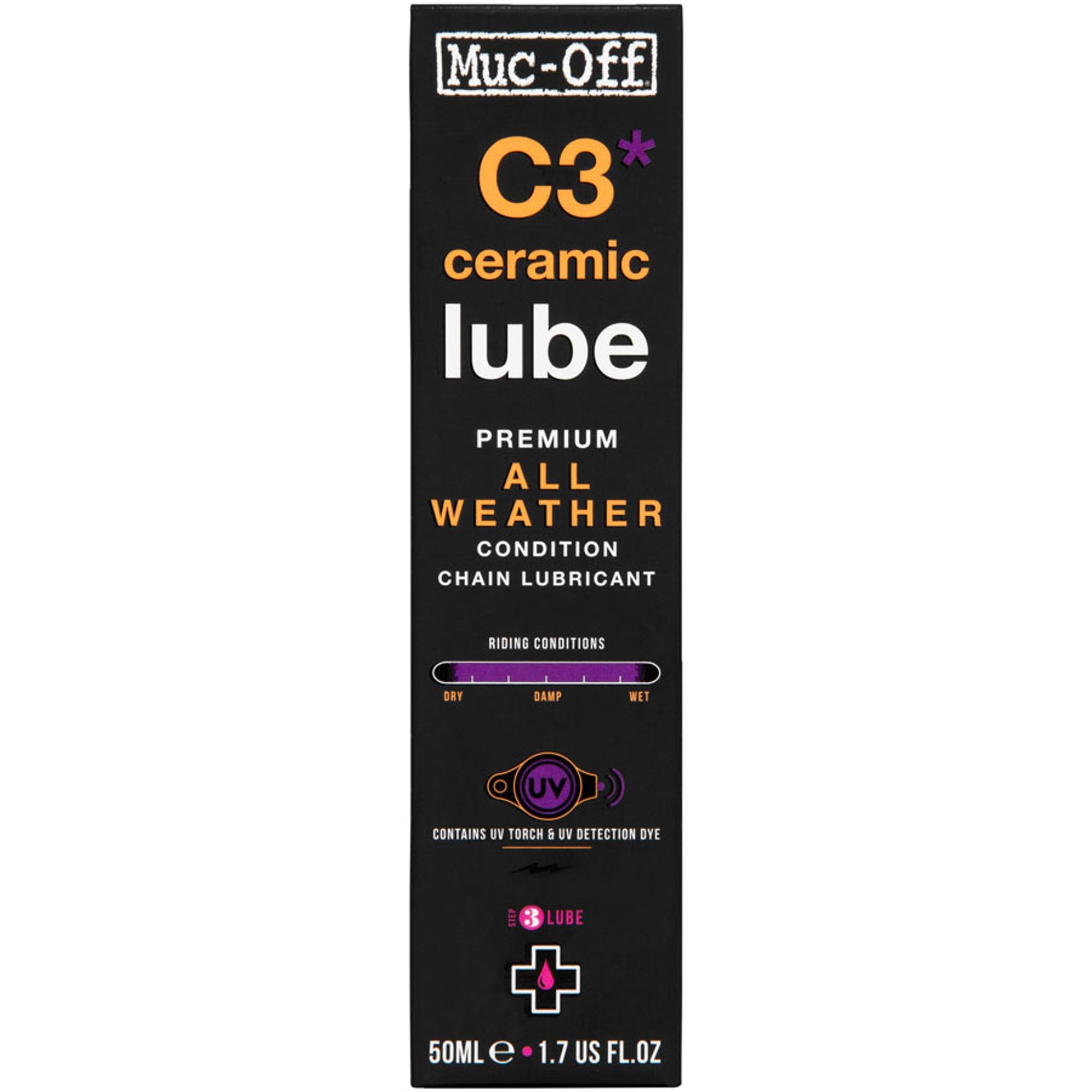 The Muc-Off C3 All-Weather Chain Lube is a high-performance synthetic lubricant infused with boron nitride additives. The unique water-repellent, non-fling formula penetrates deep into the chain link to create a durable protective coating which guards against corrosion and metal-to-metal contact, reducing wear and resulting in a longer-lasting drive chain.